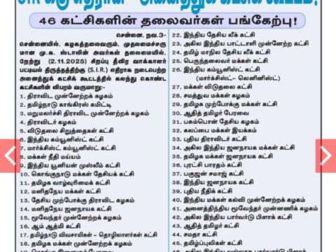 Leave a Comment on சிறப்பு தீவிர வாக்காளர் திருத்த (SIR) குறித்து 2.11.2025 அன்று சென்னையில் கூடிய அனைத்துக் கட்சி கூட்டத்தில் தமிழக முற்போக்கு மக்கள் கட்சி பங்கேற்பு