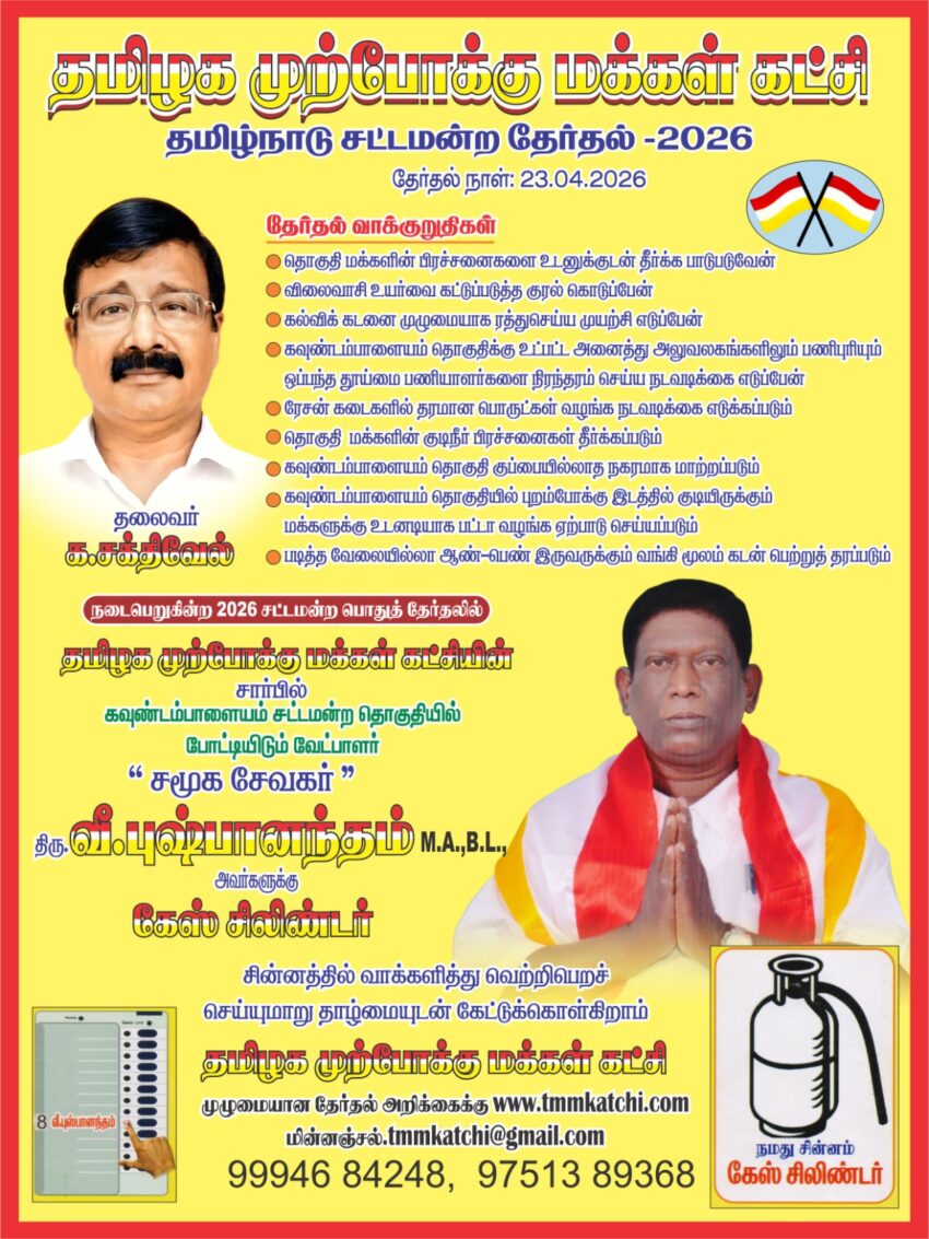 தமிழக முற்போக்கு மக்கள் கட்சி சார்பாக கோவை கவுண்டம்பாளையம் சட்டமன்ற தொகுதியில் சமுகசேகர் திரு வி புஷ்பநாதன் அவர்கள் போட்டியிடுவார் என்று தமிழக முற்போக்கு மக்கள் கட்சி தலைவர் வழக்கறிஞர் திரு சக்திவேல் அவர்கள் அறிவித்தார்
