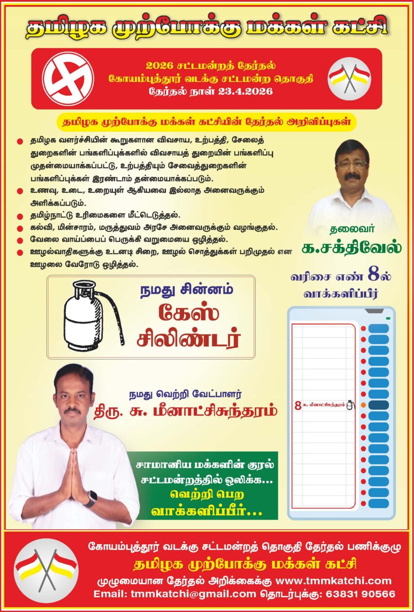தமிழக முற்போக்கு மக்கள் கட்சியின் கோயம்புத்தூர் மாவட்டம் வடக்கு சட்டமன்றத் தொகுதி தேர்தல் வாக்குறுதியை அதன் தலைவர் வழக்கறிஞர் திரு சக்திவேல் அவர்கள் அறிவித்தார்கள்