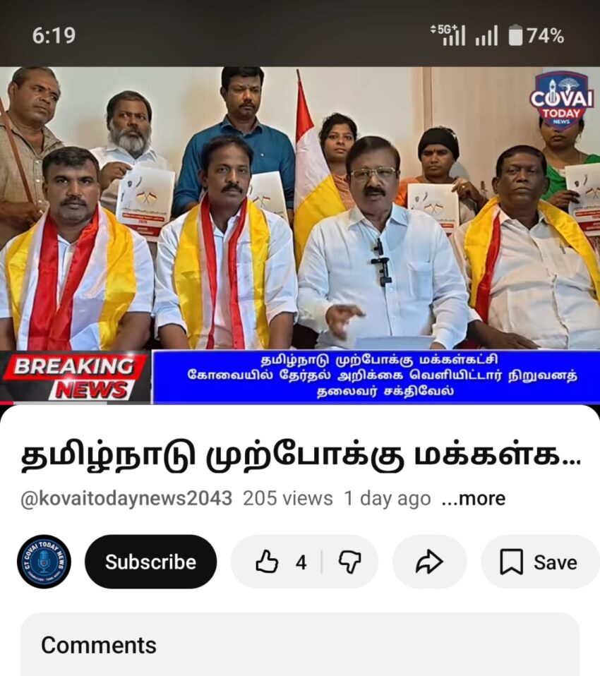 தமிழ்நாடு முற்போக்கு மக்கள்கட்சி கோவையில் தேர்தல் அறிக்கை வெளியிட்டார் நிறுவனத் தலைவர் சக்திவேல்